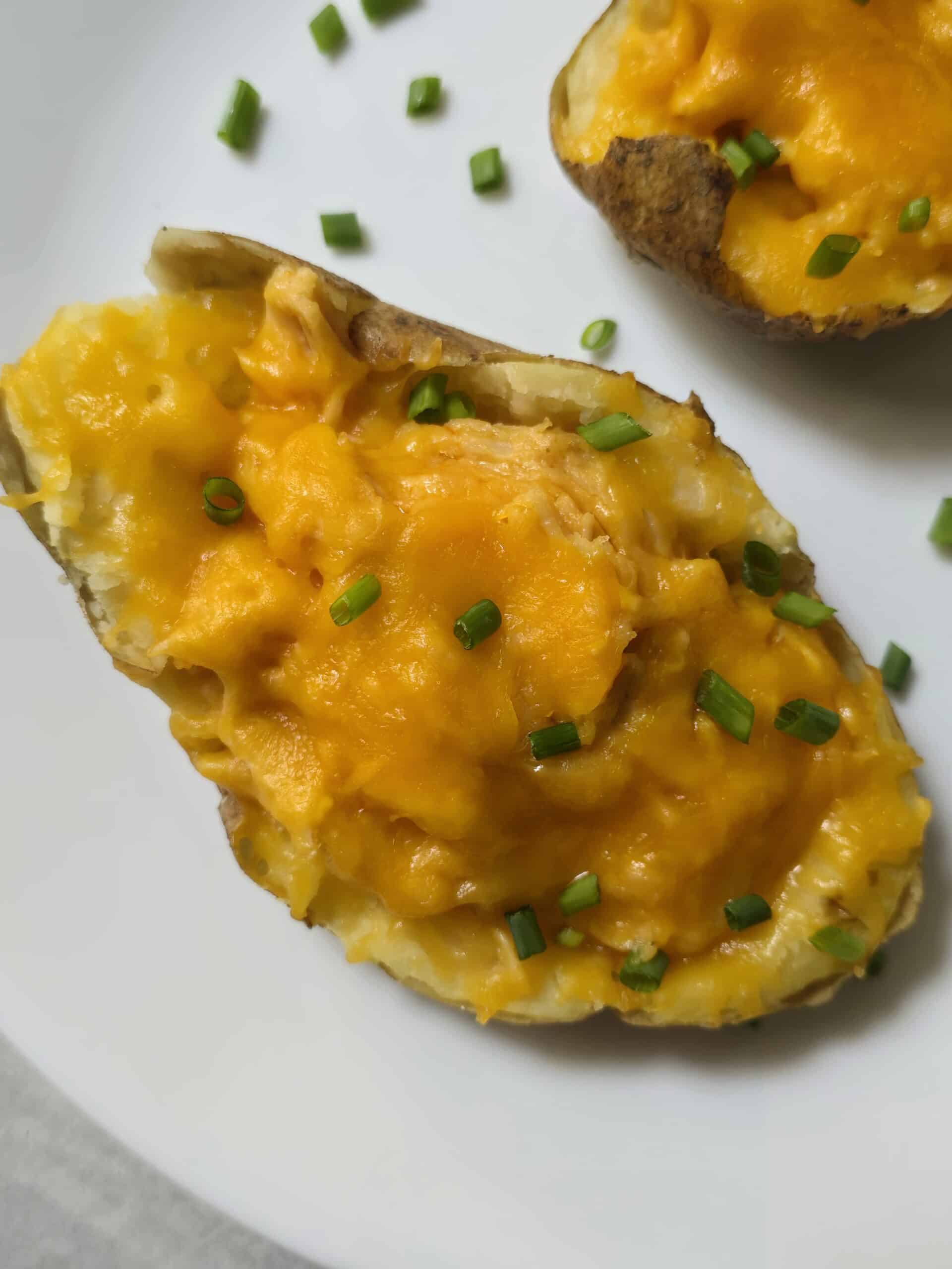 - Spoon the buffalo chicken mixture back into the potato skins. Top with extra cheddar cheese and place the potatoes back in the oven. Bake at 375°F for 15-20 minutes until heated through and the cheese is bubbly.