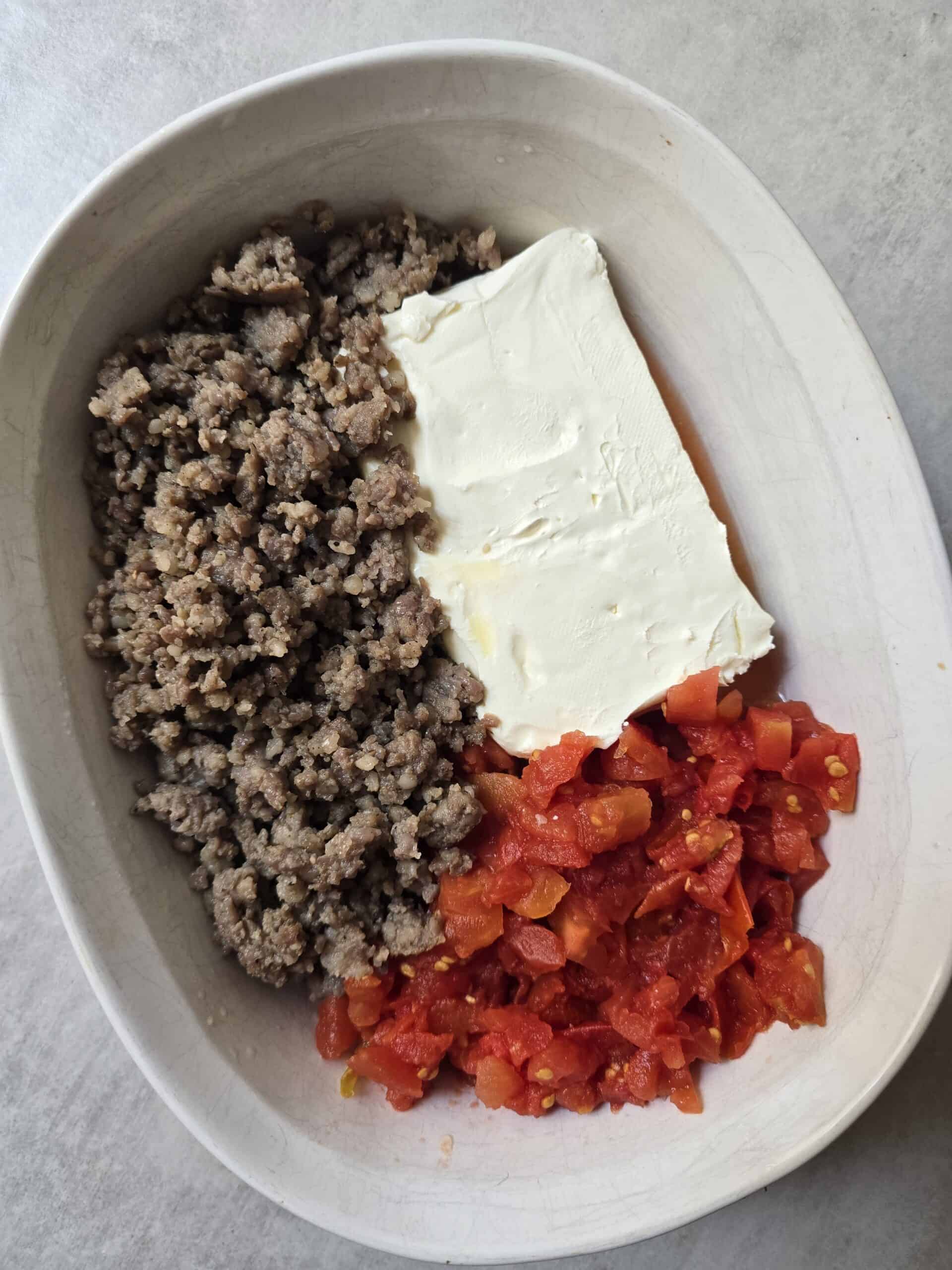 - Make the dip completely (cook sausage, melt cream cheese, add tomatoes).